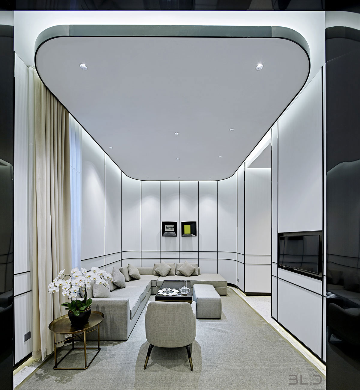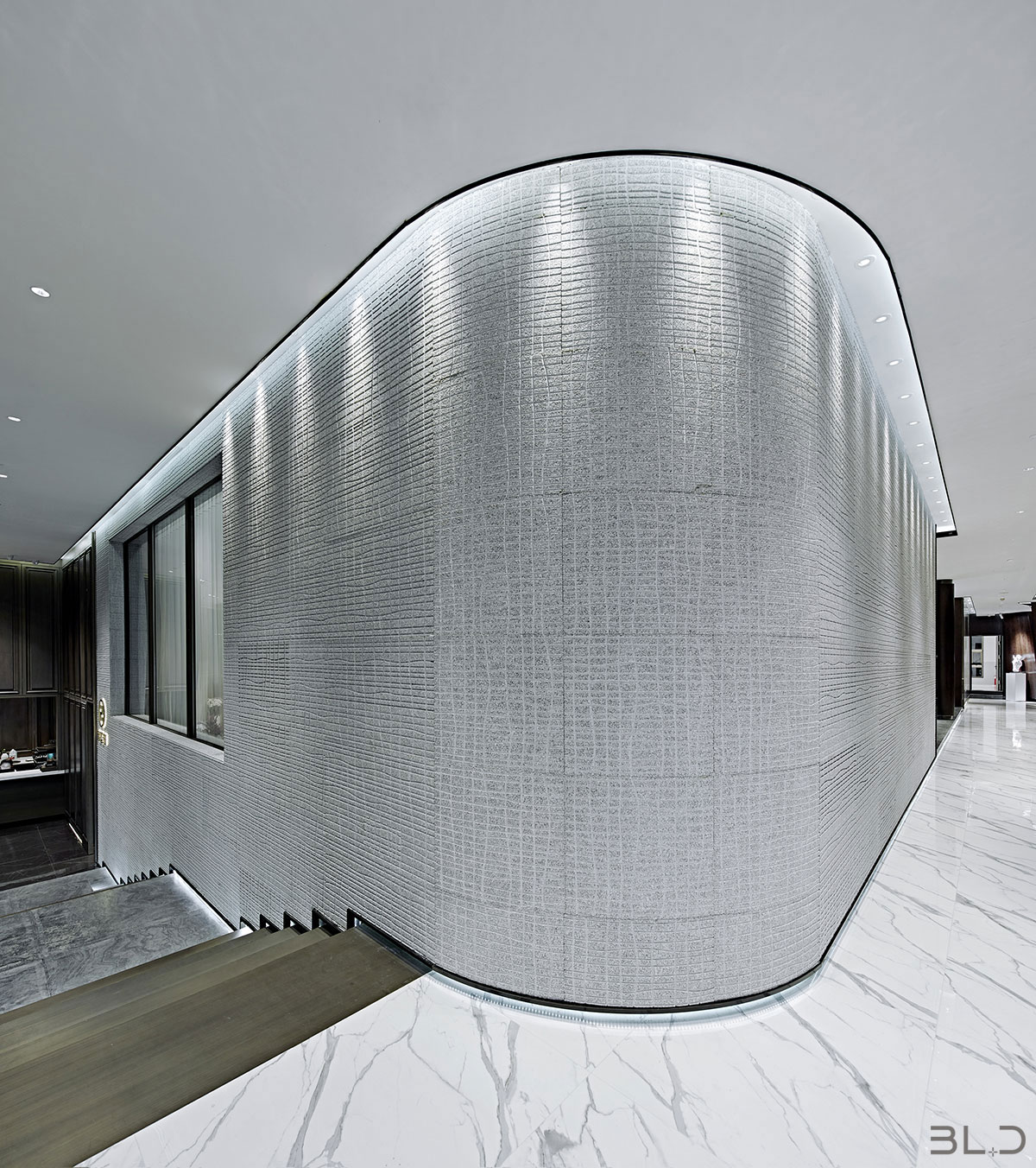 從建筑形態(tài)到室內(nèi)表現(xiàn),圓是貫穿整個(gè)案例的設(shè)計(jì)元素,在結(jié)構(gòu)中充滿了張力,又讓人感覺(jué)柔美舒適。從古典中提煉的中式韻味,淡雅清逸之致。于細(xì)節(jié)處的匠心之筆,也是設(shè)計(jì)師伽馬的初心使然。燈光營(yíng)造的明暗,簡(jiǎn)約雅致,充 滿了宋人情懷。木質(zhì)與金屬的對(duì)抗,線性幾何的延展,對(duì)建筑構(gòu)造的夸張表現(xiàn)是對(duì)室內(nèi)空間美學(xué)的準(zhǔn)確呈現(xiàn)。弧形墻面造成的視覺(jué)顯著,使空間充滿了張力與動(dòng)感。