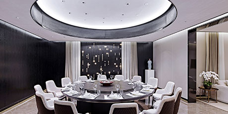 設(shè)計(jì)師伽馬對(duì)設(shè)計(jì)的態(tài)度極為“苛刻”。每一張茶臺(tái)都是根據(jù)功能精心設(shè)計(jì)的,桌面上鑲嵌圓形銅板和石材做茶海,污水經(jīng)過(guò)石頭下緩緩流走,功能和美學(xué)的統(tǒng)一達(dá)到了極致。從餐桌的高度、用餐區(qū)的寬度,餐椅的舒適度等,都是 經(jīng)過(guò)多次探討和實(shí)踐的成果。