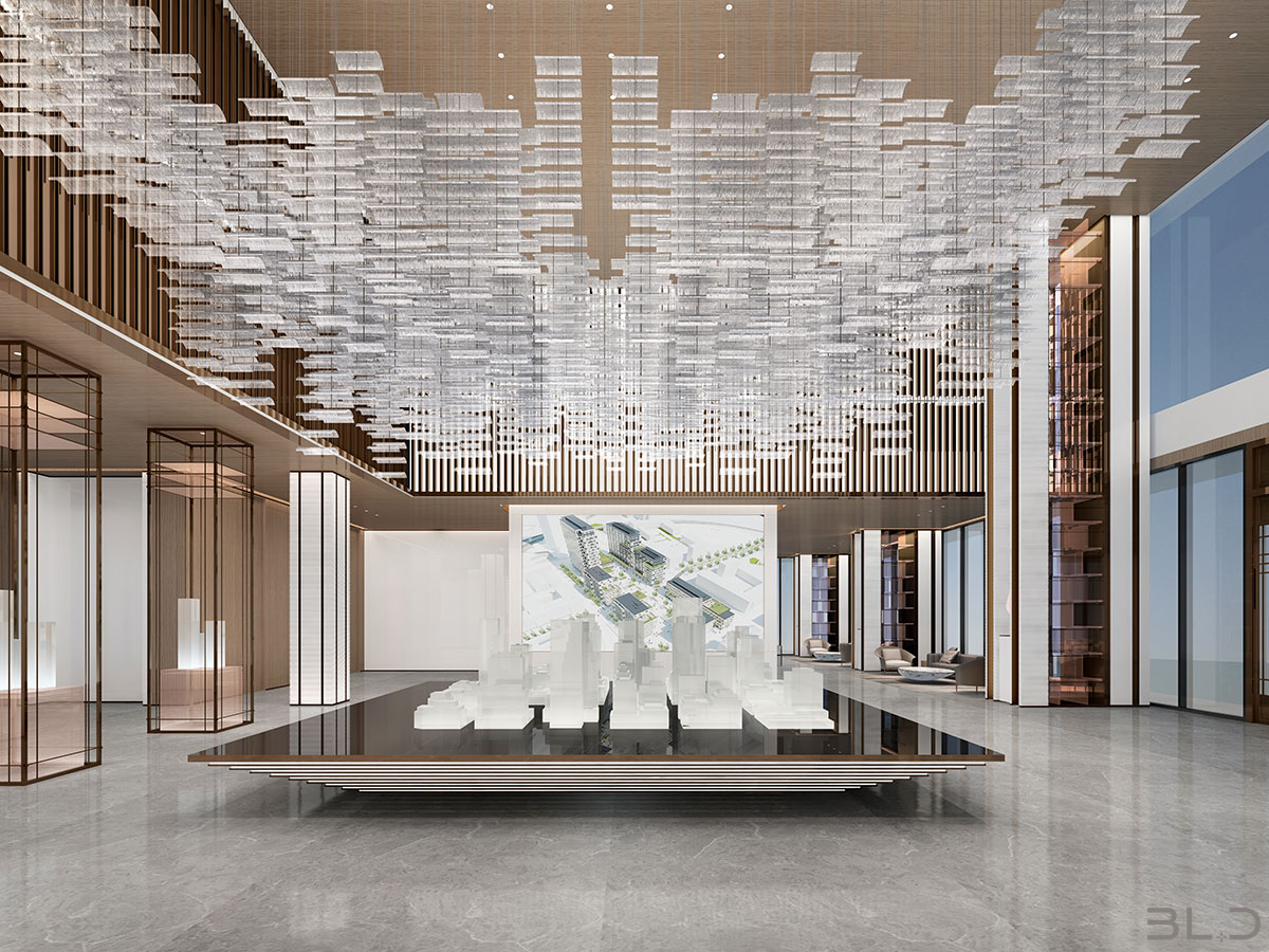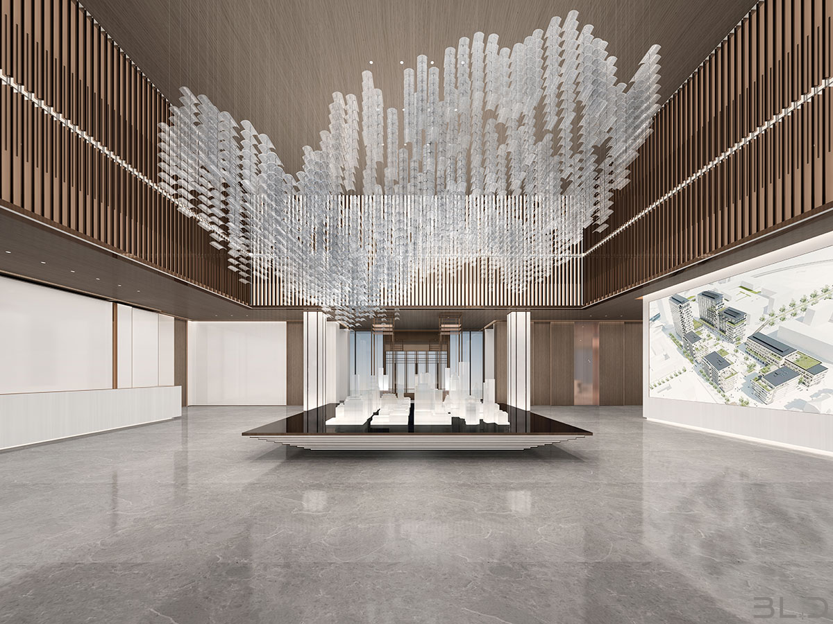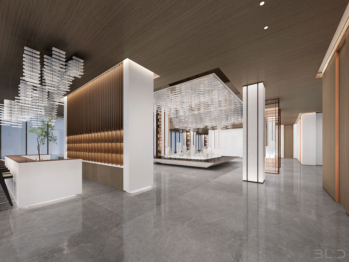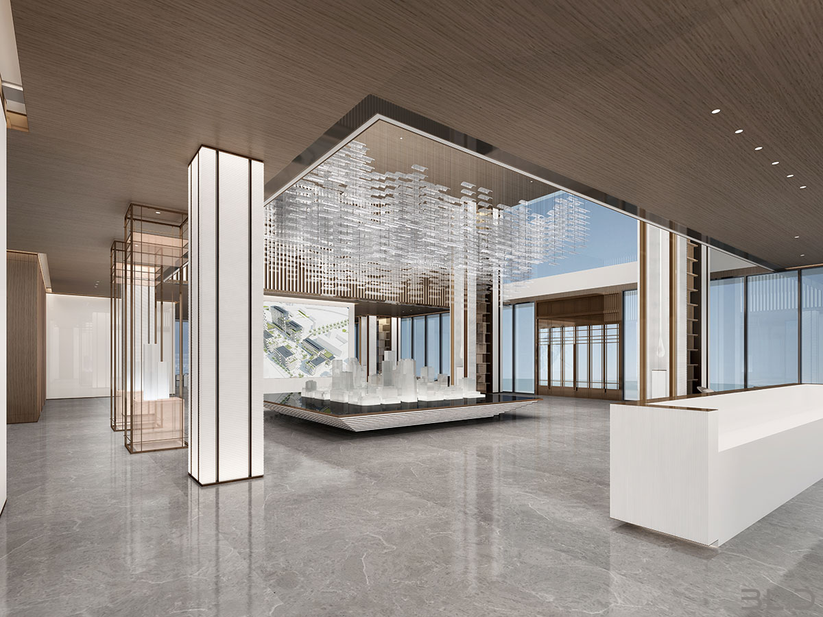 售樓處功能區(qū)分散在整個(gè)空間中,形成流暢清晰的循環(huán),平衡了隱性和顯性之間的關(guān)系,在布局中也融入了未知和交互,以留出更多的想象空間。未知刺激下的人與靜態(tài)物品的互動(dòng),可以為空間注入活力。整個(gè)空間營(yíng)造 出簡(jiǎn)約的空間基調(diào)。帶有紋理的大理石和木制藝術(shù)裝置被引入,以減輕廣闊空間的空虛感??臻g中的物品與自然和藝術(shù)相連。只有在與人互動(dòng)時(shí),他們才能開(kāi)始扮演角色。淺色調(diào)平衡了建筑結(jié)構(gòu)的厚重感,也豐富了空間 的層次感。入口處下沉的燈飾結(jié)構(gòu)打破了空曠感,同時(shí)也豐富了視覺(jué)體驗(yàn)。水吧、休息區(qū)和洽談區(qū)緊密相連,共同形成社交的錨點(diǎn)。整個(gè)售樓處以藝術(shù)美學(xué)和極簡(jiǎn)主義為特色,激發(fā)人們與自然的互動(dòng)。