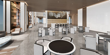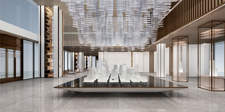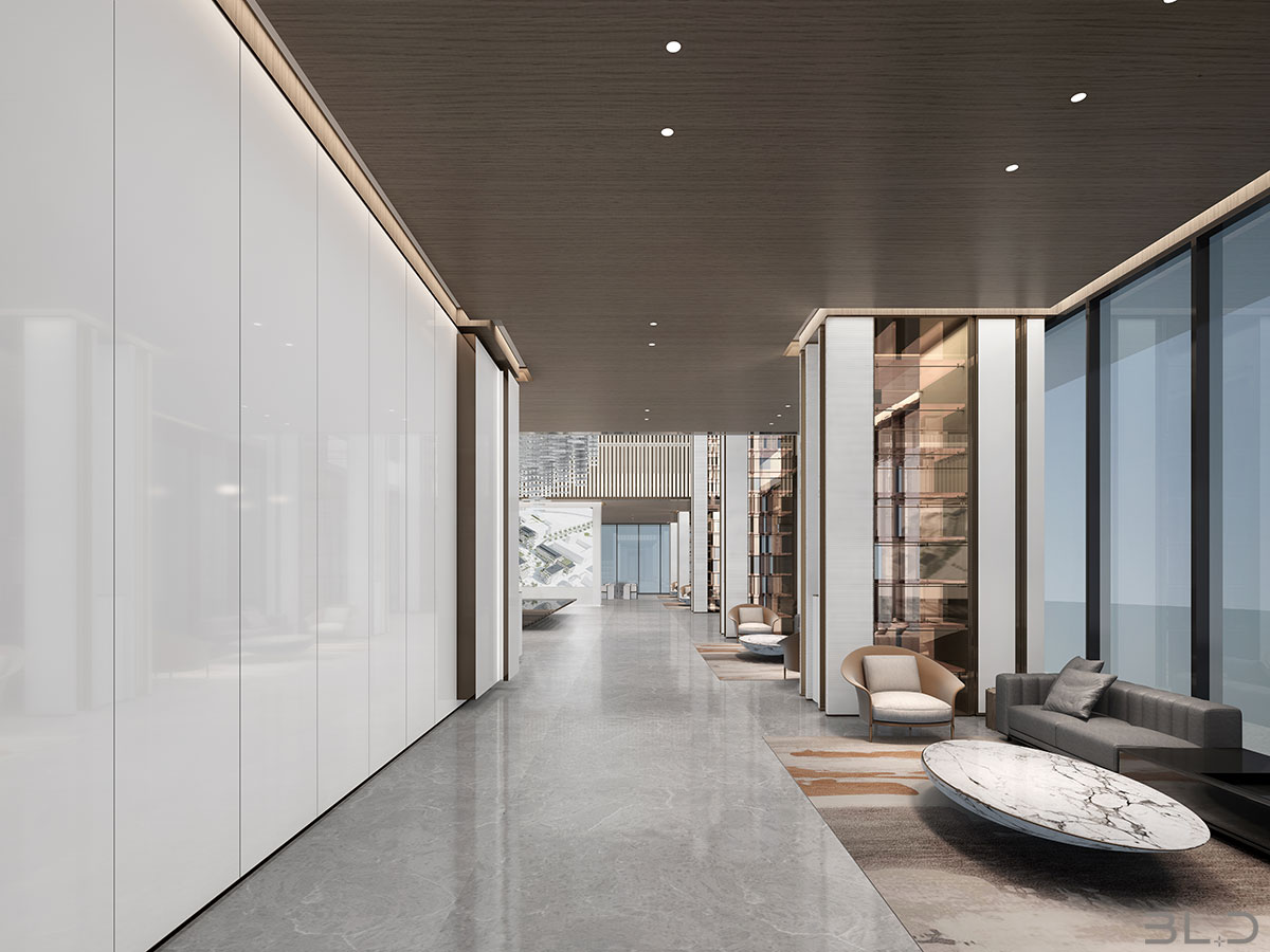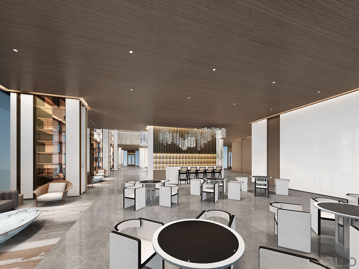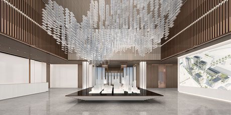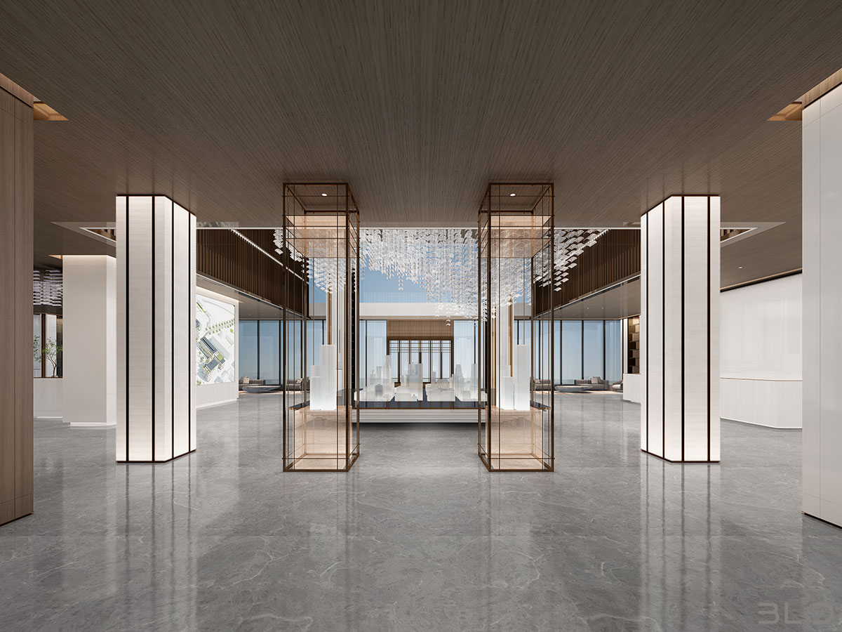 售樓處功能區(qū)分散在整個(gè)空間中,形成流暢清晰的循環(huán),平衡了隱性和顯性之間的關(guān)系,在布局中也融入了未知和交互,以留出更多的想象空間。未知刺激下的人與靜態(tài)物品的互動(dòng),可以為空間注入活力。整個(gè)空間營(yíng)造 出簡(jiǎn)約的空間基調(diào)。帶有紋理的大理石和木制藝術(shù)裝置被引入,以減輕廣闊空間的空虛感??臻g中的物品與自然和藝術(shù)相連。只有在與人互動(dòng)時(shí),他們才能開(kāi)始扮演角色。淺色調(diào)平衡了建筑結(jié)構(gòu)的厚重感,也豐富了空間 的層次感。入口處下沉的燈飾結(jié)構(gòu)打破了空曠感,同時(shí)也豐富了視覺(jué)體驗(yàn)。水吧、休息區(qū)和洽談區(qū)緊密相連,共同形成社交的錨點(diǎn)。整個(gè)售樓處以藝術(shù)美學(xué)和極簡(jiǎn)主義為特色,激發(fā)人們與自然的互動(dòng)。