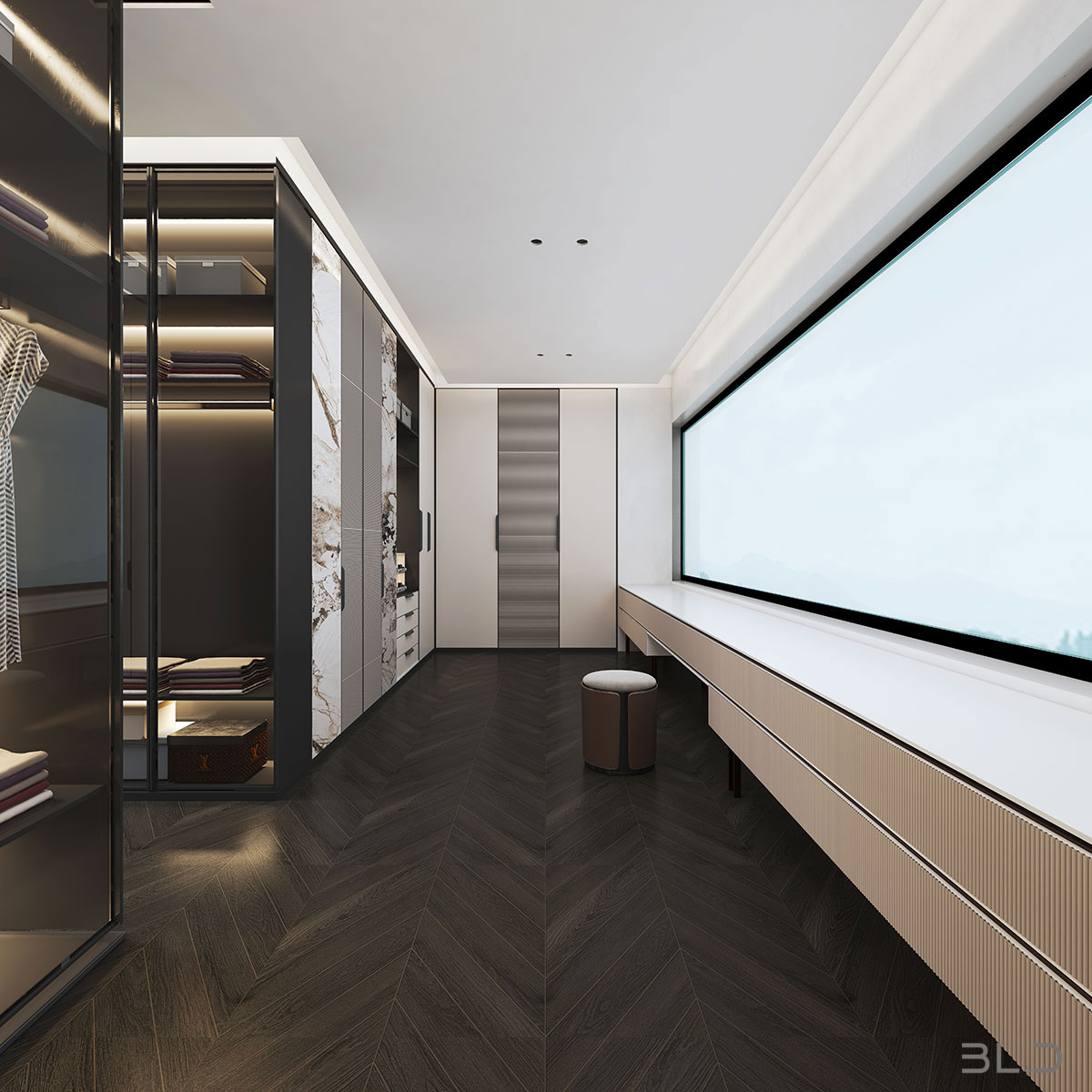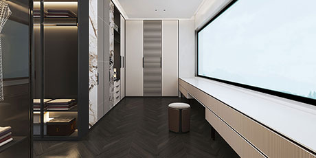 在別墅設(shè)計的主要空間之一臥室,在設(shè)計上卻不作浮華堆砌,只用干凈洗練的線條建立一個清簡恍如只隱約存在的空間關(guān)系,輔以原色為主的軟裝,任由樸素營造一個心靈可以完全放空的環(huán)境,在過道、衣帽間和洗手間這樣的次要空間則利用材料營造質(zhì)感,讓人感嘆莫辜負(fù)了這片刻的美好時光。